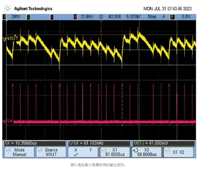 电感电流纹波的下降也会在转换器的输出电压中表现出来。输出电压纹波变得更加嘈杂,这可能会影响敏感负载并降低EMI性能。此影响可以从图5中看出。