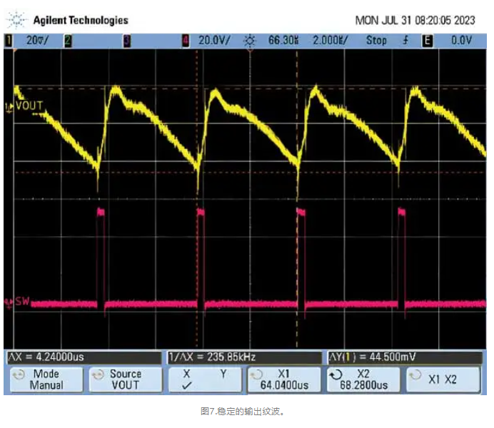 这个问题有一个简单的解决办法。导通时间主要受开关频率影响,因此设计人员可以通过降低频率来解决该问题。但这样做的代价是需要更大的功率级元件,主要是更大的电感。降压转换器的功能改进体现在周期间一致的导通时间,以及图6中稳定的电流纹波和图7中稳定的输出纹波。