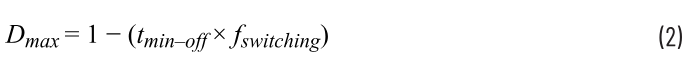某些应用可能需要较小的降压比,这可能会违反转换器的最小关断时间规范。tmin-off是tmin-on的补充,定义为电感未由输入源充电的最短时间。与导通时间要求类似,SMPS必须关断规定的时间以确保FET正常运行(允许正常放电)。当要求的占空比大于允许的最大占空比(由式2给出)时,就会违反最小关断时间规范。