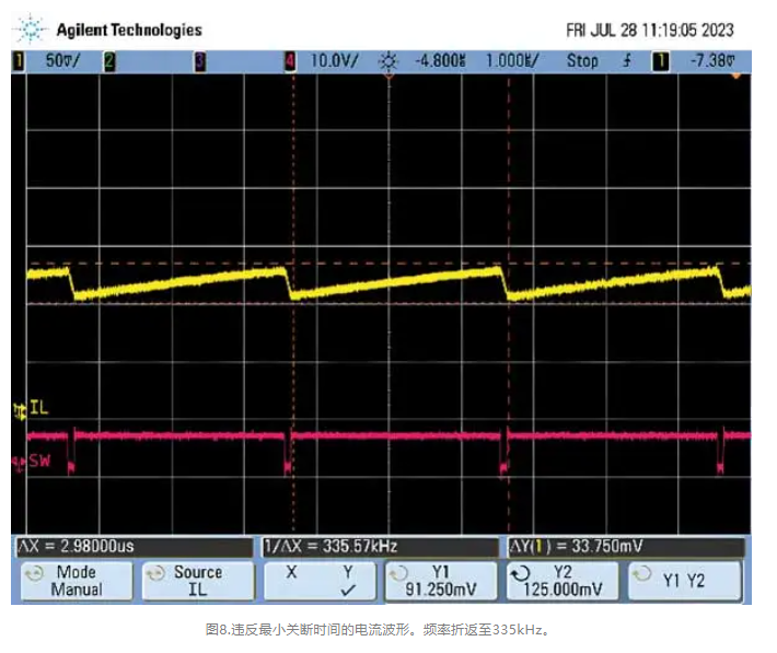 如果占空比超过最大值,SMPS将折返其配置的频率,以避免违反最小关断时间规范。这一点可以从图8中看出。器件最初配置为2MHz频率