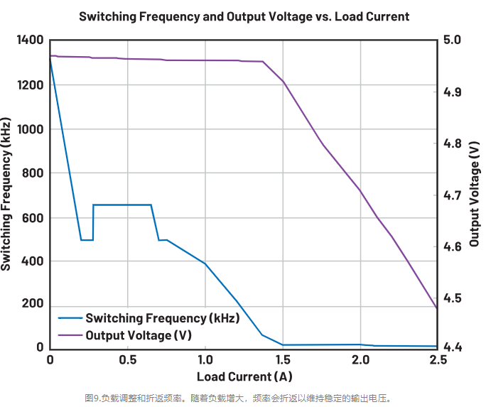在图9中可以看到,随着负载增加,器件频率会折返以保持恒定的输出电压。器件在DCM下运行至约0.28A,这就是频率下降到约495kHz然后又回升至657kHz的原因。以657kHz的频率运行时,器件可以保持正常操作,直至负载达到0.7A。此时频率降低以保持适当的输出电压,直至负载达到1.4A左右。发生这种情况时,器件无法在保持输出电压的同时将频率降低到100kHz以下(该器件指定的最低反馈频率),因此输出电压开始下降。