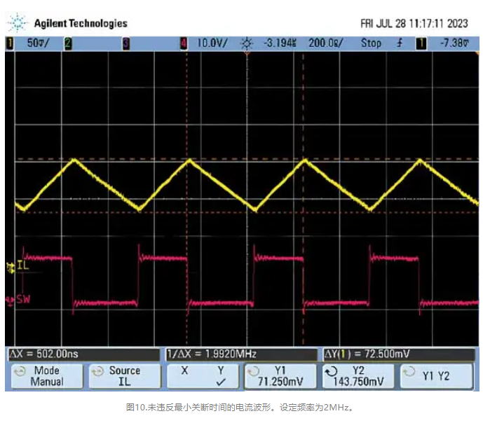 这个问题的解决办法不像违反最小导通时间规范那么简单。设计人员通常需要满足特定的输入电压和输出电压要求,因此无法随意更改占空比来延长关断时间。如果设计人员可以提供更大的输入电压,则器件将以设定的频率工作,因为较小占空比会防止器件违反最小关断时间规范。这一点可以从图10中看出,其中器件以设定的2MHz频率运行。
