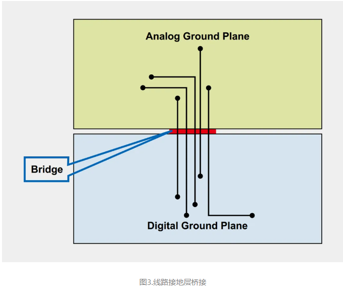 如果两个层仅在电源处连接(图2),则返回电流被迫直接流回电源接地,这是一个真正的大型环路!另外,不幸的是,不同RF电势下使用长线缆连接的模拟和数字接地层,形成一个非常有效的偶极天线。首选使用一个持续接地层以避免这种长接地环路,但是如果使用分割接地层绝对必要并且线路穿过分割线则各层应首先在一个位置连接,以形成一个返回电流的桥(图3)。对所有线路进行布局,让它们穿过该桥,直接在每条线路下面提供一条返回通路,从而产生一个非常小的环路面积。这种方法的典型应用是权衡何时使用高分辨率(>20-bit)∑-∆模数转换器(ADC)。