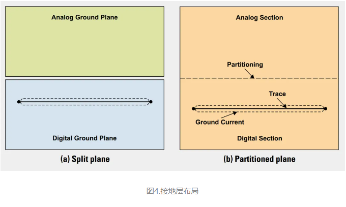 一种更好的方法是“分区”。仅使用一个接地层始终为首选,把PCB划分为模拟部分和数字部分(参见图4b)。模拟信号必须安排在板的模拟部分,而数字信号必须安排在板的数字部分,并且所有层上都有这两个部分。在这种情况下,数字返回电流不会存在于接地层的模拟部分,并且保持在数字信号线迹下面。图4比较了一个分割层和一个分区层。