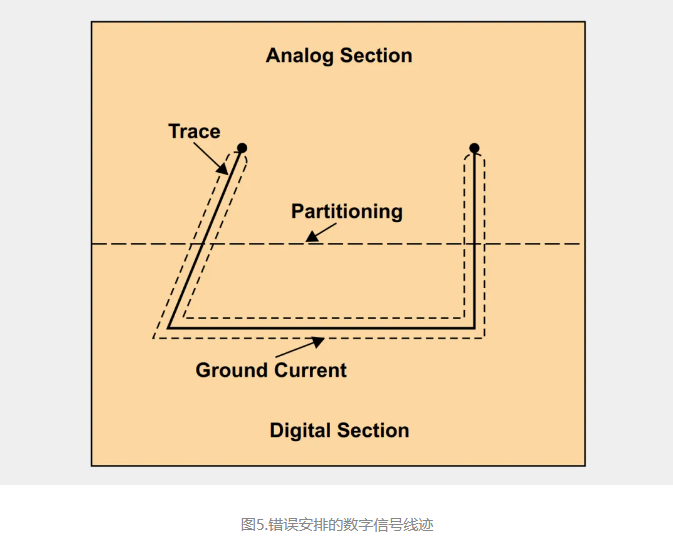 分区方法存在的唯一问题是,当模拟信号错误地安排在板的数字部分(反之亦然)时则难以有效,如图5所示。因此,对于所有PCB布局而言,重点是使用一个单个接地层,把它划分为模拟和数字部分,然后运用信号安排原则。