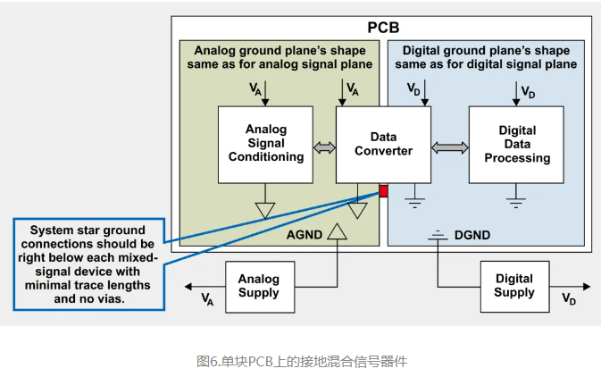 大多数数据转换器的产品说明书都说明了相对于单一PCB的接地方法,并且通常为制造厂商自己的评估板。一般而言,我们建议把PCB接地层分割为一个模拟层和一个数字层。我们还 建 议,把 转 换 器 的 模 拟 接 地(AGND)和数字接地(DGND)主引脚放在一起,并且在同一个点连接模拟和数字接地层,如图6所示。最终,在混合信号器件处形成系统的星形接地点。
