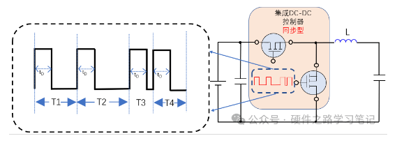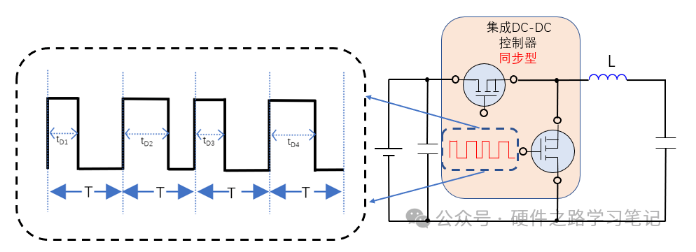 如下图是PWM控制模式的DC-DC,PWM(Pulse Width Modulation),脉冲宽度调制,顾名思义,放大图可以看出,其周期T是不变的,而脉冲宽度tD1、tD2、tD3、tD4、是不同的。