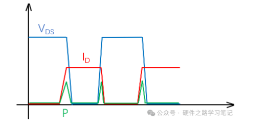 而实际应用中,由于MOS开通与关断都需要一定的时间,同时VDS也不能做到0,因此存在着VDS与ID同时不为0的情况,由此会消耗功率。如下图,消耗功率P随MOS管的开关而起伏。