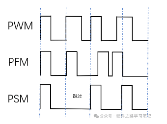 PFM( Pulse Frequency modulation) ,脉冲频率调制模式,如下图,其脉冲宽度t0是恒定的,但其周期T1、T2、T3、T4是变化的,因此称其是脉冲频率调制。