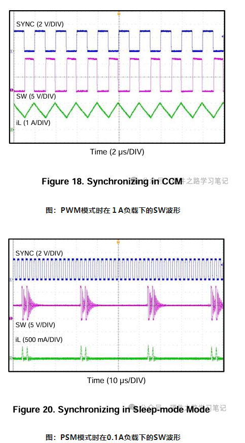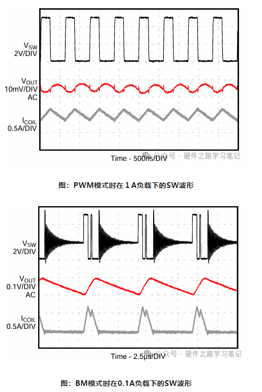 如下图分别是TI的TLV62569在PWM模式与PSM模式下VSW的波形图,由横轴时间轴可以看出,PSM模式下开关时间间隔增大了,也就意味着开关损耗降低了。