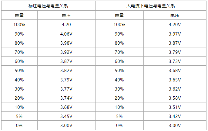 下面给出一个标准的电压对电池剩余容量的表格(左侧)以及大电流恒流放电电池电压对容量的表格(右侧),此表只能大致提供参考,还需实际测试。