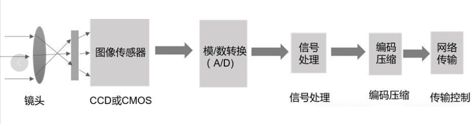 网络摄像机的主要器件/模块包括镜头(lens)、图像传感器(sensor)、模数转换模块信号处理模块、压缩编码模块、网络传输模块等。目前摄像机的主控芯片SOC已经集成了所有信号处理相关的功能。