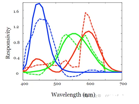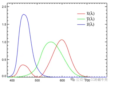 国际照明委员会(CIE)于1931年首次用纯数学的方法定义了一种颜色空间模型,即CIE 1931 XYZ 颜色空间,它覆盖了人眼所能感知的全部颜色,而且不依赖于任何特定的物理实现。在该模型中,CIE定义了三个函数用于模拟人眼的三种锥细胞对可见光谱的响应曲线,如下图所示: