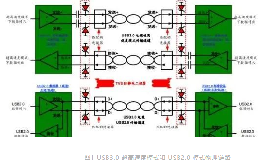 为了支持 USB3.0 电缆所包含的全部线路,必须强制规定采用一种新的连接器形状。新的 USB3.0 连接器的基本要求是,必须向下兼容 USB2.0 连接器。从静电防护的角度而言,这导致标准 A连接器的超高速度模式线路很容易被静电击中(在主机侧和器件侧)。一种强有力的对策是在USB3.0 链路中实现高效的静电防护机制。