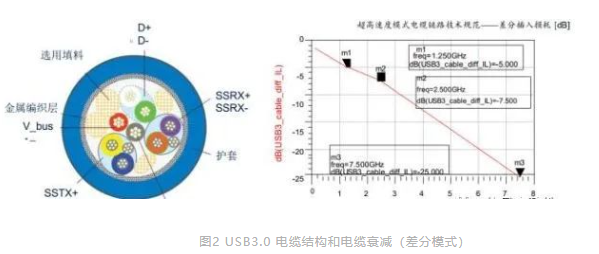 整个收发区具备 90 欧姆差分阻抗。考虑了发送端和接收端的寄生效应。测得数据表明了 USB3.0 电缆的状态。规定 USB3.0 电缆的最大长度为 3 米。