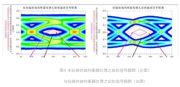 图4所示为整个USB3.0链路的眼图模拟(误码率为1E6时)。在图4(左图)中,接收信号是在未经接收端均衡器处理之前测得的。在图(右图)中,信号是经接收端均衡器处理之后测得的。