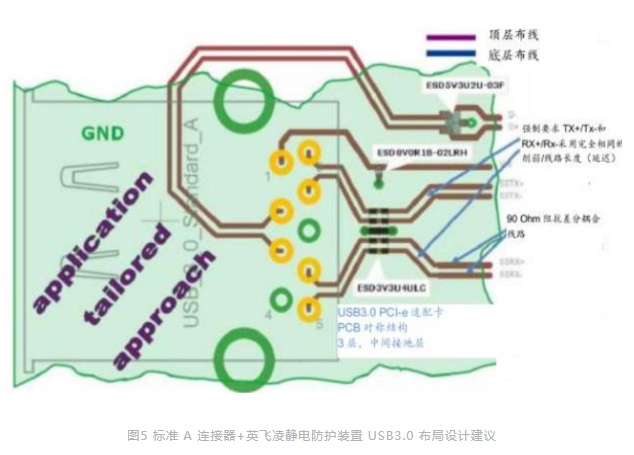 图 5 所示为兼具静电防护电路的 USB3.0 标准A连接器横截面布局设计示例。