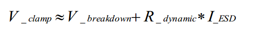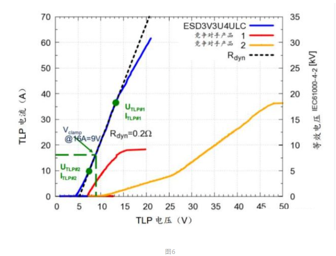 可根据TLP(传输线路脉冲)测定值,推导出动态电阻。(参见图6)为确保应用的安全,击穿电压必须与所保护的线路上施加的最高电源电压和最高信号电平相一致。动态电阻(R_dyn)应当尽可能小。结合最优击穿电压和最低动态电阻,可最大限度地减小 IC 上的残余静电放电应力。