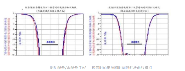 分别在未配备 TVS 二极管(红色轮廓线)和配备了 TVS 二极管(ESD3V3U4ULC,蓝色轮廓线)的情况下,计算出眼图的张开程度。(参见图 7)