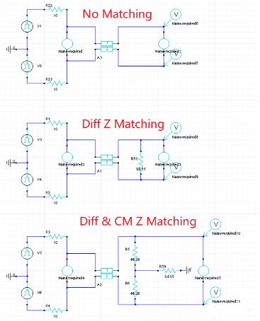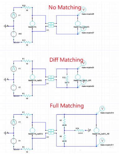 接下来对差分线不同匹配方式进行了仿真对比,如下图为负载端不接匹配、负载端接差分匹配、负载端接差分共模匹配三种情况。