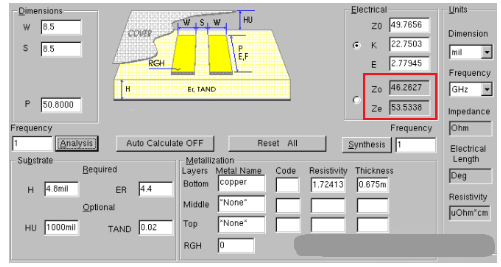 下图是上述差分线对应的电气参数,可以看到奇模阻抗为Zo=46.26Ohm,偶模阻抗Ze=53.53Ohm,这样就可以计算出差分共模匹配下的R1=Z0,R2=(Ze-Zo)/2得到上述原理图的电阻值。