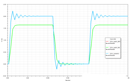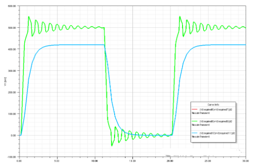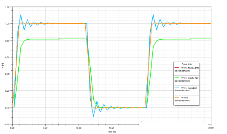 下图为负载端的差分电压波形,同样可以看到,不接匹配下,穿在反射,在负载端如果接了匹配,不管是差分匹配还是差分共模都匹配,信号质量均是完整的。