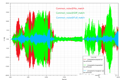 下图为三种匹配方式对应的共模噪声情况,可以看到,负载端不带匹配共模噪声最大,然后时差分匹配次之,最后是接了差分共模匹配的共模噪声最小。