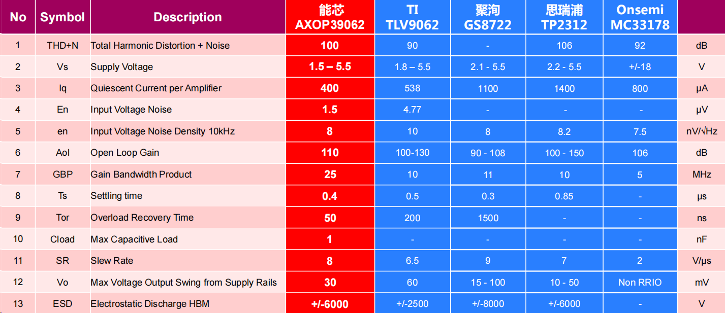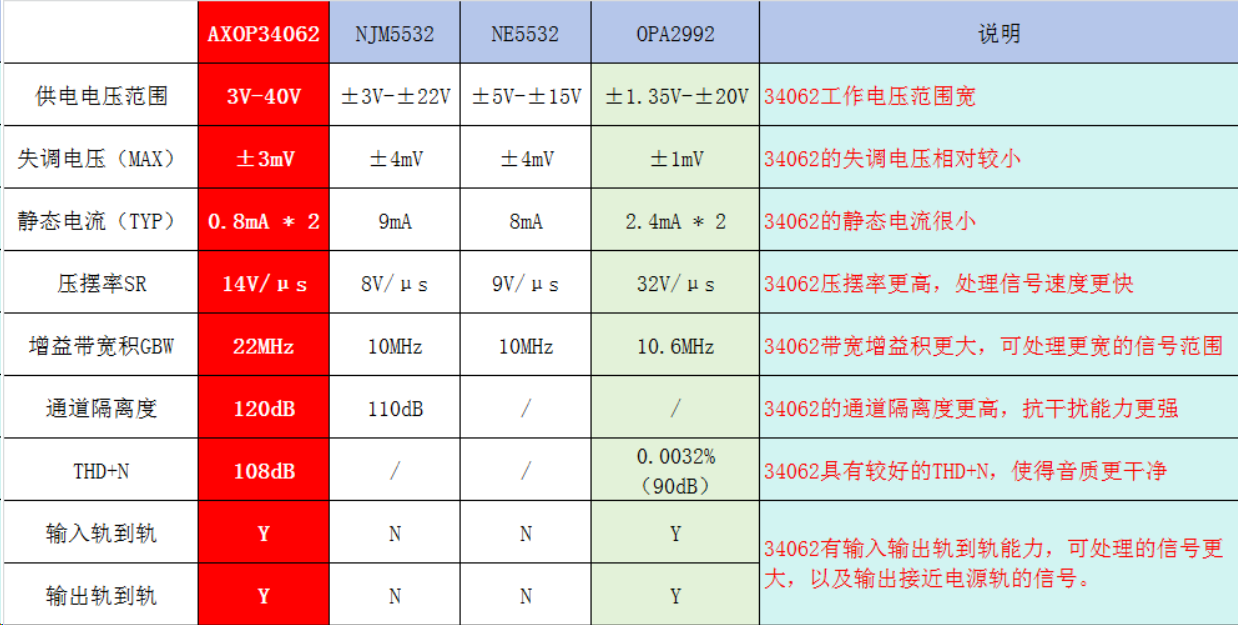 AXOP34062 双通道 40V 中压 运算放大器卖点对比;
