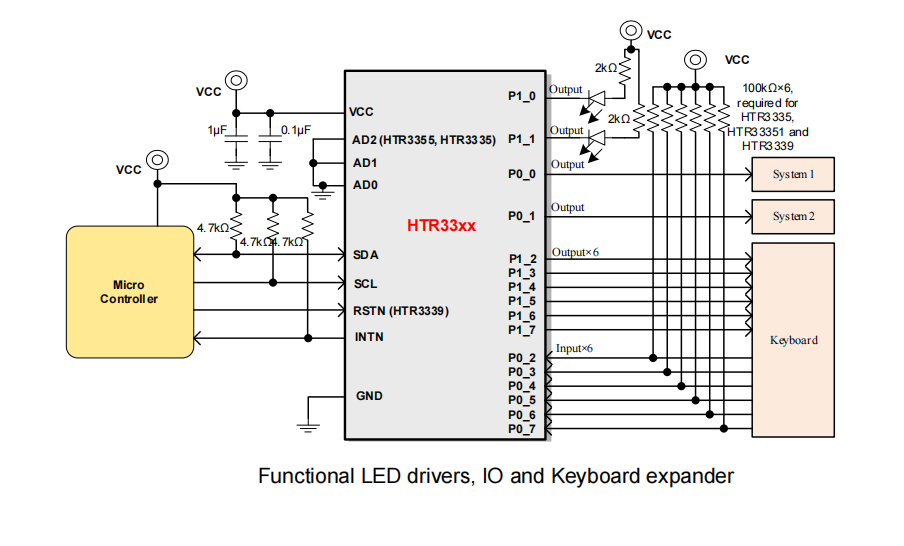 HTR33xx是一款I2C和SMBus IO扩展器2.2V~5.5V电源供电。16个IO端口中的任何
