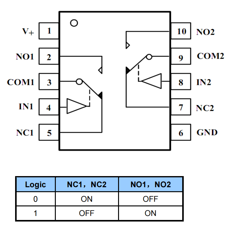 其极低的开关阻抗——0.5Ω(TYP)和快速开关时间——tON=16ns, tOFF=15ns,可以大大减少电池供电便携式产品的信号损失,改善音频及视频输出级。LN3005在封装上采用了DFN-10和MSOP-10的封装,体积小巧,节省了很多空间。LN3005集成了两个单刀双掷开关,由两个常开NO和两个常关NC开关组成,可以用来作为2选1的多路选择开关。