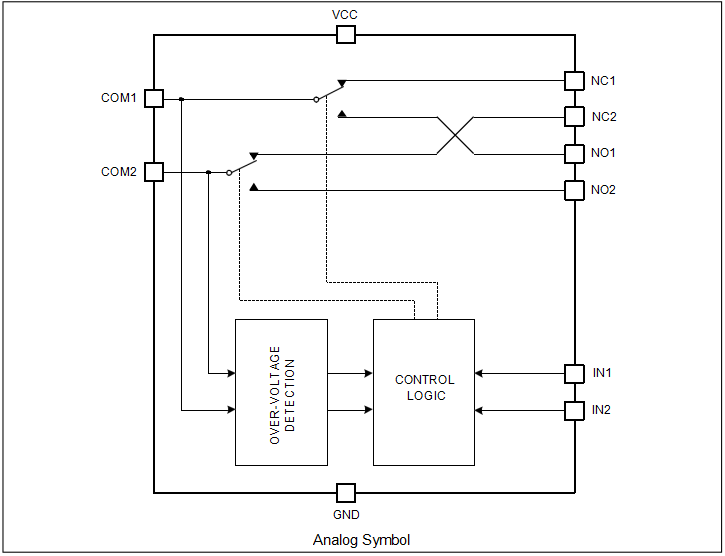 The part also features guaranteed Break Before Make (BBM) switching, assuring the switches never short the driver. The switches can handle negative signal down to -3.6V. When the voltage of the COM terminal exceeds OVP threshold, the channels from the COM terminal to the NC and NO terminals will be turned off.
