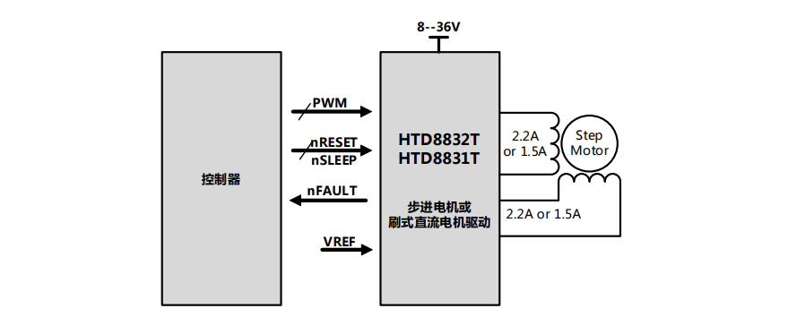 HTD8831T/8832T有两路H桥驱动器,最大驱动输出36V±1.5A/ ±2.2A ,可驱动两个直流有刷电机,或者一个双极步进电机。双极步进电机可以以整步、2细分、4细分运行,或者用软件实现高细分。