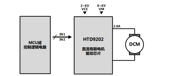 HTD9202具有一个PWM (IN1/IN2)输入接口。