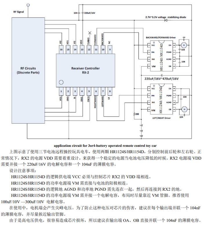 HR1124S/HR1154D是应用于直流电机方案的单通道H桥驱动器芯片。HR1124S/HR1154D的H桥驱动部分采用低导通电阻的PMOS和NMOS功率管。低导通电阻保证芯片低的功率损耗,使得芯片安全工作更长时间。此外HR1124S/HR1154D拥有低待机电流、低静态工作电流。这些性能使能HR1124S/HR1154D易用于玩具方案。