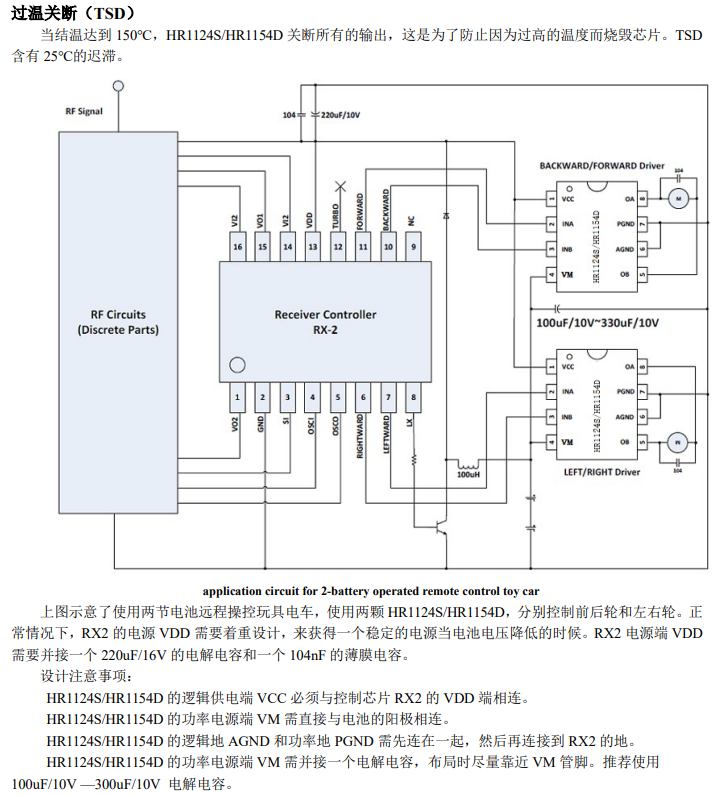 HR1124S/HR1154D内部含有过温关断保护。当负载电机是低阻抗的,或者输出端短路,这样使能HR1124S/HR1154D的输出电流急剧上升,同时内部温度也急剧上升。当芯片温度超过最大温度阈值(典型150℃),HR1124S/HR1154D会关断所有的输出,防止潜在安全隐患。只有当确认了芯片回归到安全的工作温度,内置温度迟滞电流才重新控制驱动电路。