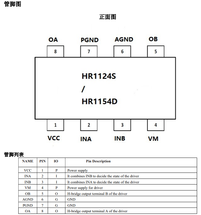 产片介绍:HR1124S HR1154D是应用于直流电机方案的单通道H桥驱动器芯片。HR1124S HR1154D的H桥驱动部分采用低导通电阻的PMOS和NMOS功率管。低导通电阻保证芯片低的功率损耗,使得芯片安全工作更长时间。此外HR1124S HR1154D拥有低待机电流、低静态工作电流。这些性能使能HR1124S HR1154D易用于玩具方案。