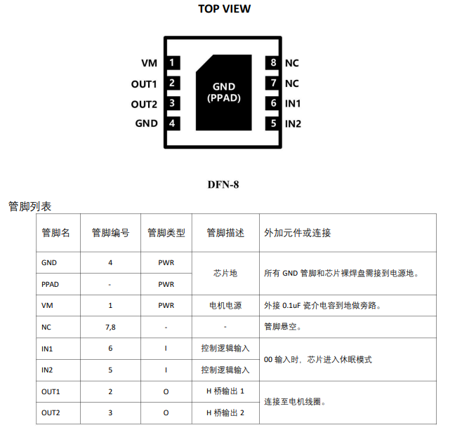 HR8837提供一种带有裸露焊盘的DFN-8 (2mm*2mm) 封装,且是无铅产品,满足环保