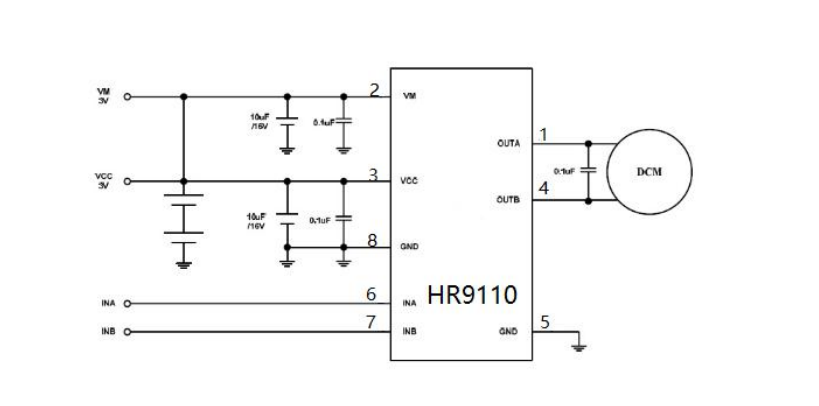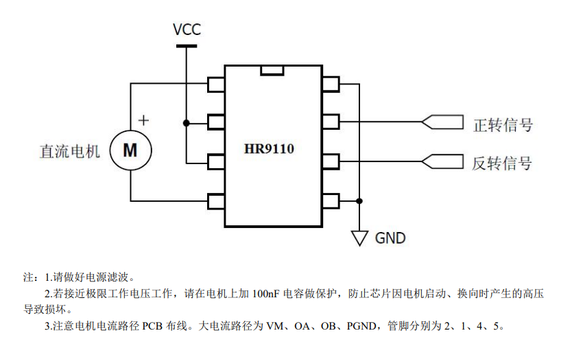 HR9110内部含有过温关断保护。当负载电机是低阻抗的,或者输出端短路,这样使能