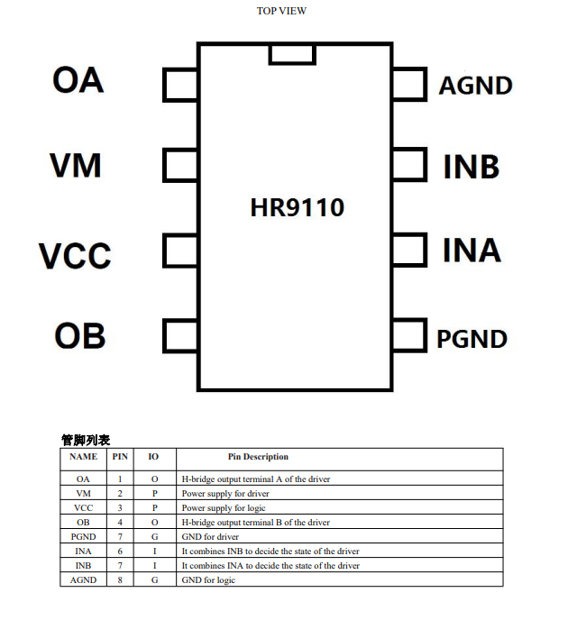 HR9110是应用于直流电机方案的单通道H桥驱动器芯片。HR9110的H桥驱动部分采用低