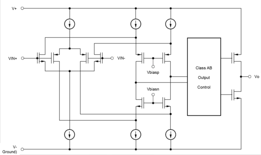 input stage: a N-channel input differential pair in parallel with a P-channeldifferential pair, as shown