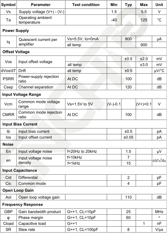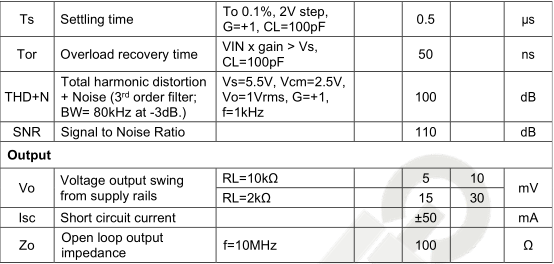 For Vs = (V+)- (V) = 5V at Ta = 25°C, RL = 10kΩ connected to Vs/2, Vcm = Vs/2, and Vout =Vs/2
