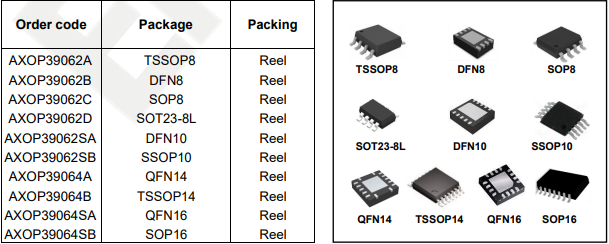 产片介绍:Excellent THD+N 100dB Excellent SNR 110dB Rail-to-rail input and output Low input offset voltage: +0 5mV typ Unity-gain bandwidth:25MHz Low quiescent current (per opamp): 400μA typ Operational at supply voltages as low as 1 5V Easier to stabilize with higher capacitive load due to resistive open-oop output impedance Shutdown function(AXOP39062S and AXOP39064S)
