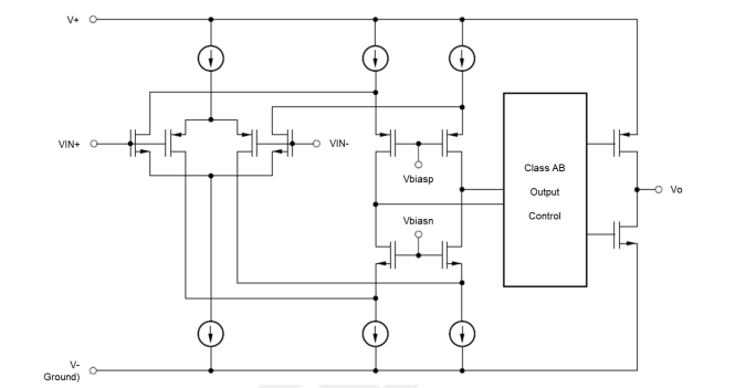 robust output drive capability. A class AB output stage with common source Mosfets achieves