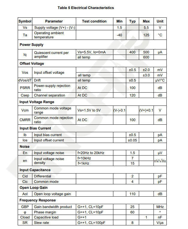 For Vs = (V+) - (V-) = 5V at Ta = 25°C, RL = 10kΩ connected to Vs/2, Vcm = Vs/2,