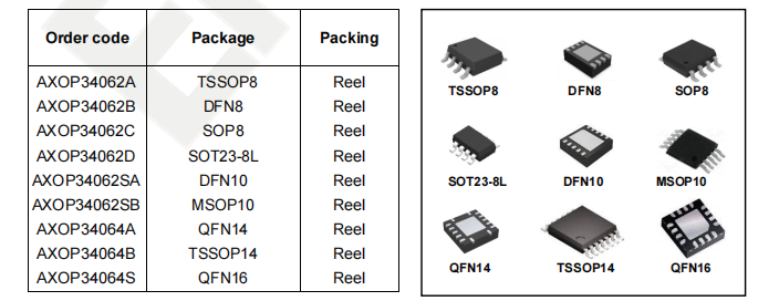 产片介绍:Supply voltages from 3V to 40V Excellent THD+N 100dB Excellent SNR 110dB Rail-to-rail input and output Low input offset voltage: ±0 5mV typ Unity-gain bandwidth: 25MHz Low quiescent current (per opamp): 600µA typ @40V Easier to stabilize with higher capacitive load due to resistive open-loop output impedance Shutdown function (AXOP34062S and AXOP34064S)
