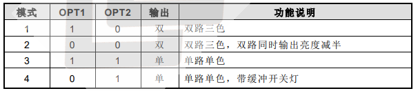 ● 共有 4 种模式可选,由 OPT1/OPT2 管脚上电前的输入状态来决定。芯片管脚有内部