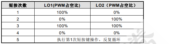 • 第 1 次短按,LO1 输出,PWM 占空比 100%,进入工作状态