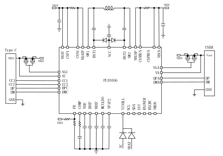 PL93056是集成了快充全协议的、高效率的、带充电管理的同步双向升降压SOC。它是一个针对type-CPD快充应用而设计的、功能丰富的、使用灵活的升降压转换器平台。它可以被设置成降压充电、升压充电以及升降压充电几种模式。PL93056 集成了I2C 接口,可方便与外部系统通信。通过I2C可将电池电压、BUS电压、电池电流、BUS电流及各端口的电压电流信息传送到外部系统。同时,内部集成了耐高压的CC1/CC2、DP/DM USB通信协议接口。搭配普通的MCU就可为各种快充应用提供完整、强大、灵活的升降压快充方案。