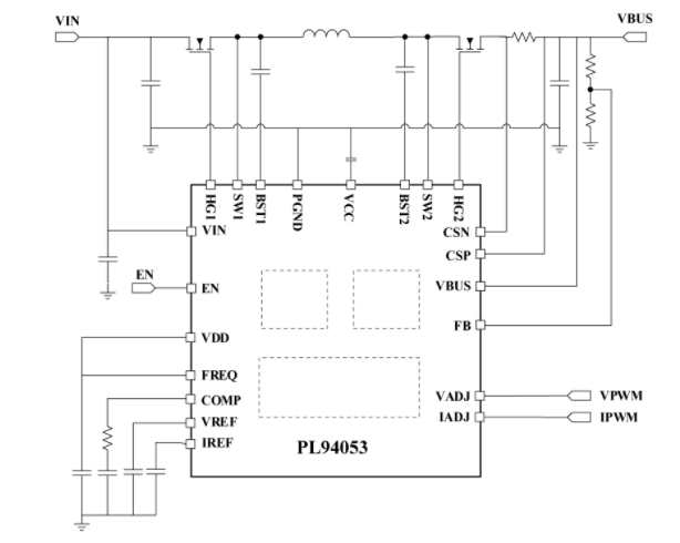 VADJ、IADJ 引脚用于编程输出 VBUS 电压和输出电流限制,提供电压控制回路、恒流回路、热调节回路、温度感应,这使得PL94053成为 USB 供电 (PD) 应用的绝佳选择。