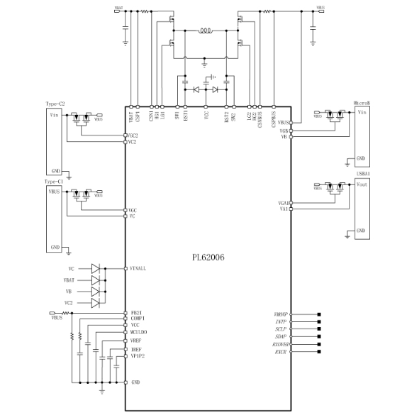 产片介绍:PL62006是一款高效、同步双向降压-升压充电器。它是一个全面而灵活的升降压充电器平台,专为大多数具有Type-C端口和PD协议的快速充电应用而设计。它可以编程为降压充电、升压充电或降压-升压充电。